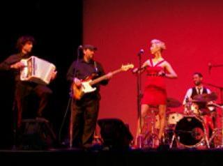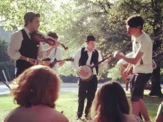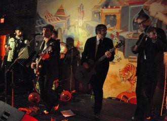 The drummer plays kick, snare, and washboard and the crazed bassist plays an acoustic (with pickups), while the lead instruments are accordion, mandolin, violin, and a banjo that has its own light show.